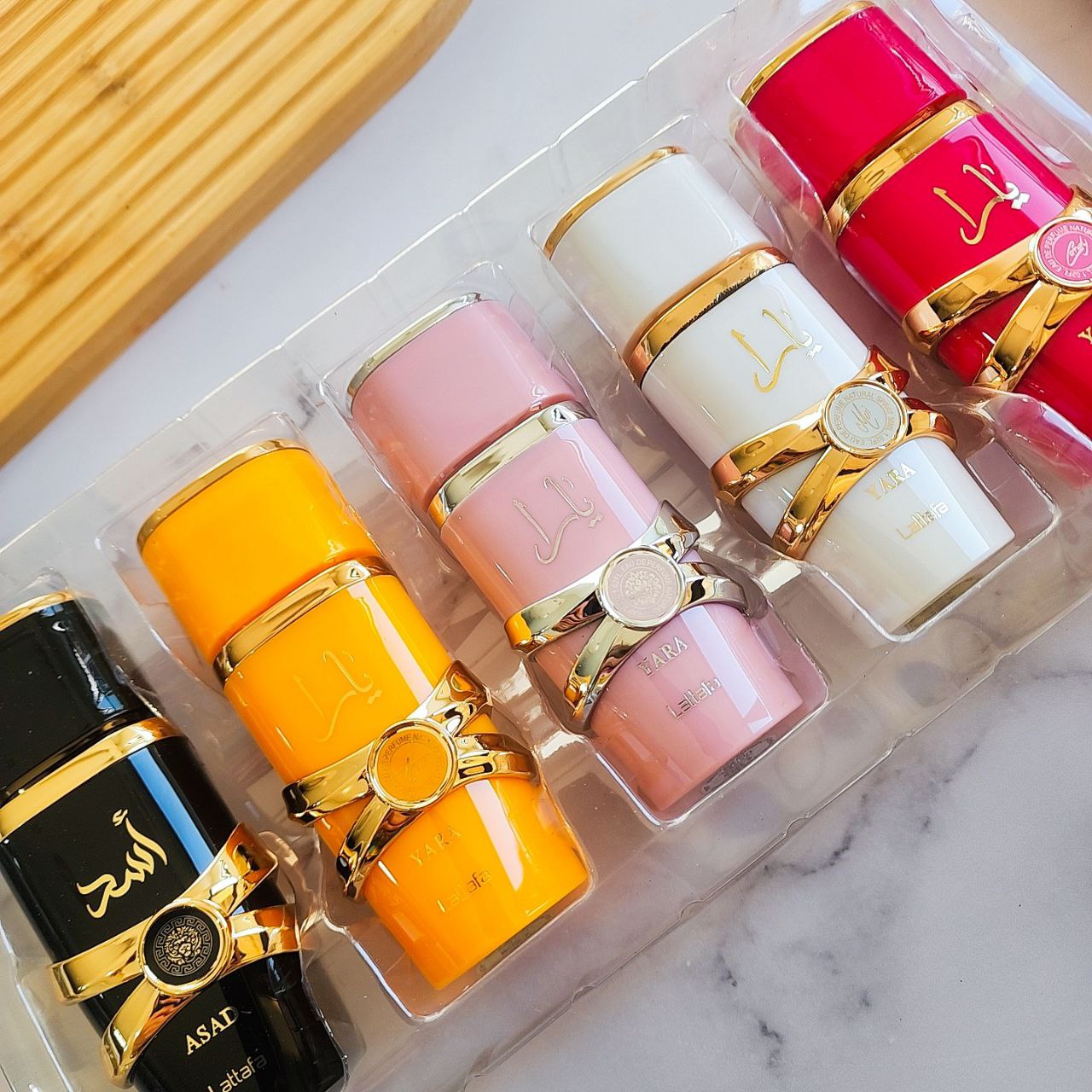 Yara (قرمز): رایحهای قویتر و شیرینتر، ترکیب میوههای قرمز و گلها. ماندگار و خاص برای مهمانیها.