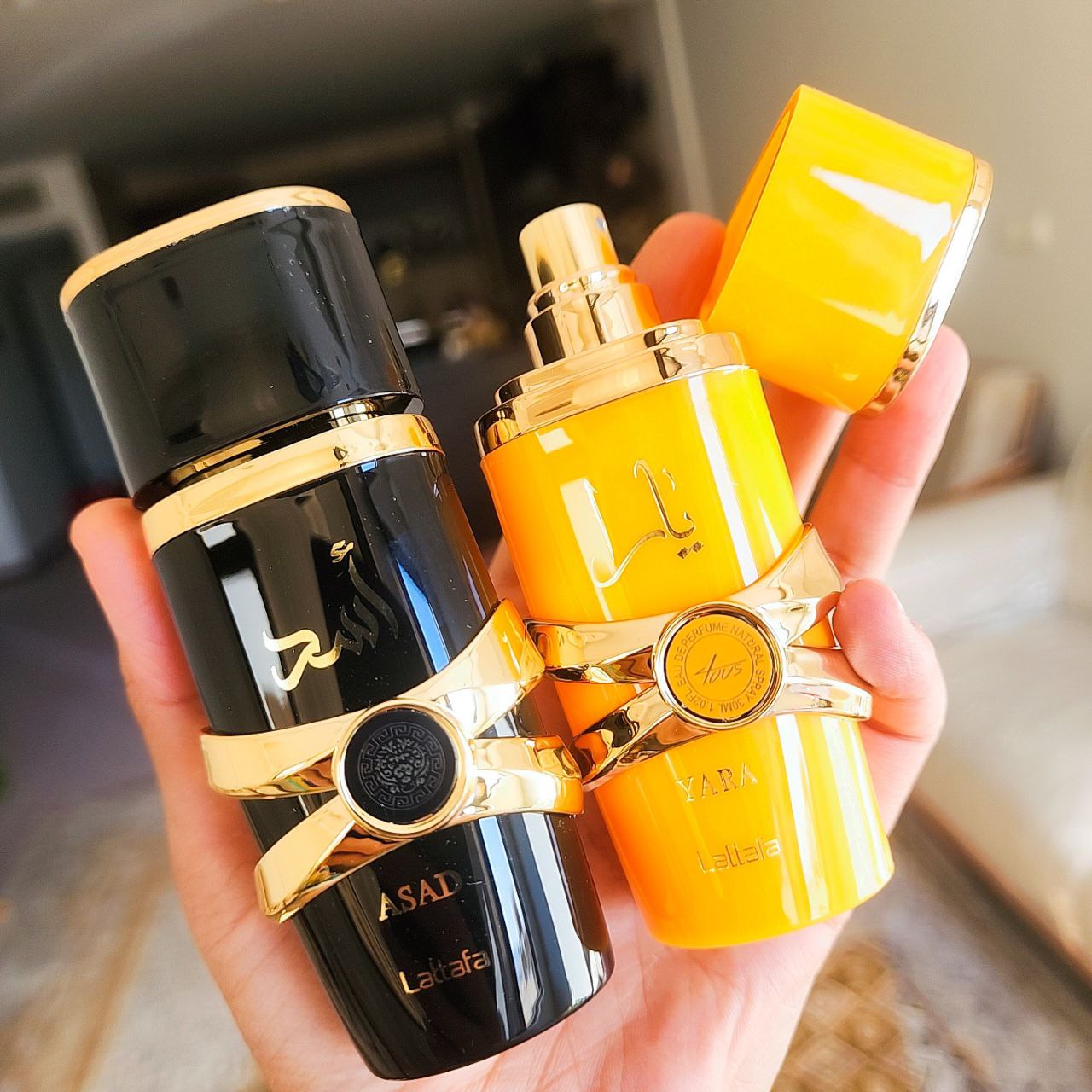 Asad (مشکی): رایحهای گرم، شرقی و مردانه با ترکیب وانیل، ادویه و نتهای دودی. مناسب برای شب و مراسم رسمی.
