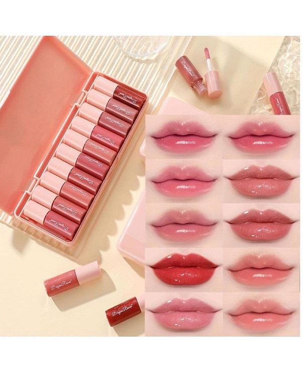 پک ۱۰تایی رژلب مایع و لیپ گلاس و شاین کادویی Dragon Rene