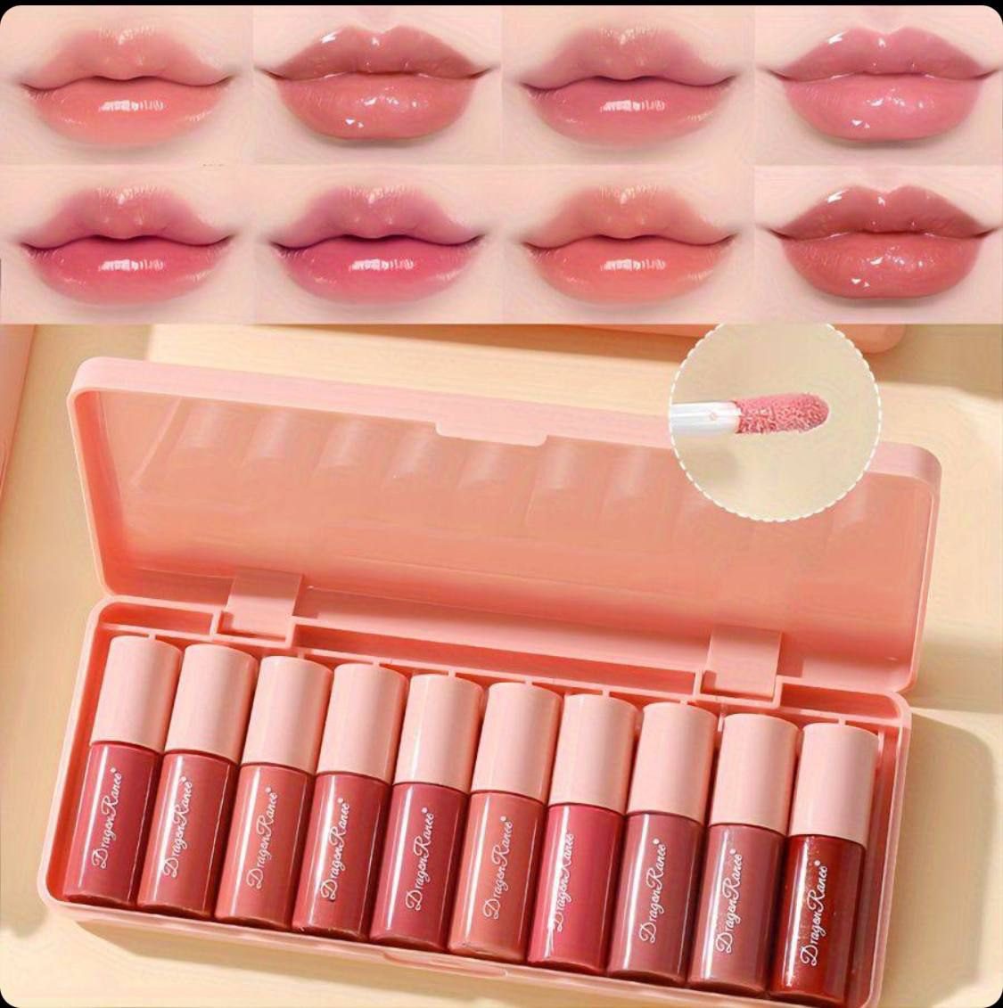 پک ۱۰تایی رژلب مایع و لیپ گلاس و شاین کادویی Dragon Rene